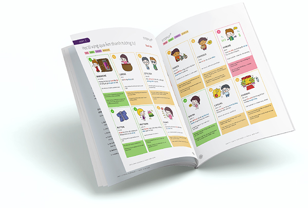 Bước 4: Học từ vựng qua Âm Thanh Tương Tự được  bẻ khóa sẵn. Từ học thuật và khó nhớ tới đâu cũng  thấm vào trí nhớ của bạn cực kì dễ dàng. Tại sao  Step Up lại phải vẽ tay từng hình cho mỗi từ vựng?  Bởi vì hình ảnh sẽ giúp tăng tới 50% hiệu quả ghi  nhớ và gợi nhớ từ vựng.